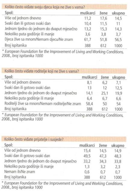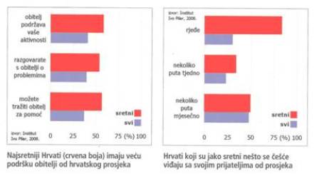 Polovica najsretnijih Hrvata tako, primjerice, svoje prijatelje vida nekoliko puta mjesečno, dok ih trećina viđa nekoliko puta tjedno. Polovica sretnih Hrvata može često ili uvijek od svoje obitelji zatražiti pomoć, dok isto može učiniti tek trećina “običnih” Hrvata, koji se ne smatraju toliko sretnima. Sretnici među nama često razgovaraju s članovima obitelji o svojim problemima, a gotovo 60 posto tih najsretnijih obitelj uvijek podržava u njihovim planovima. Drugim riječima, imaju jako dobro zaleđe, sigurnu luku u kojoj uvijek mogu naći utočište. Uspoređujući Hrvate s Nizozemcima ili, primjerice, Amerikancima, možemo vidjeti da je u Hrvatskoj više onih (36 posto) koji su vrlo zadovoljni odnosom s bližnjima, nego u Nizozemskoj (23%) ili Sjedinjenim Američkim Državama (27%). Zadovoljniji smo i svojim zdravljem, no zato su Nizozemci i Amerikanci sretniji životom u cijelosti, što možemo vjerojatno tumačiti boljim standardom života. Hrvatska istraživanja, međutim, pokazuju da se Hrvati smatraju prilično sretnim narodom, iako nisu osobito zadovoljni svojim životom (ocjena životnog zadovoljstva ne prelazi trokju na skali od 0-10, dok stupanj sreće prosječno iznosi 7,7).