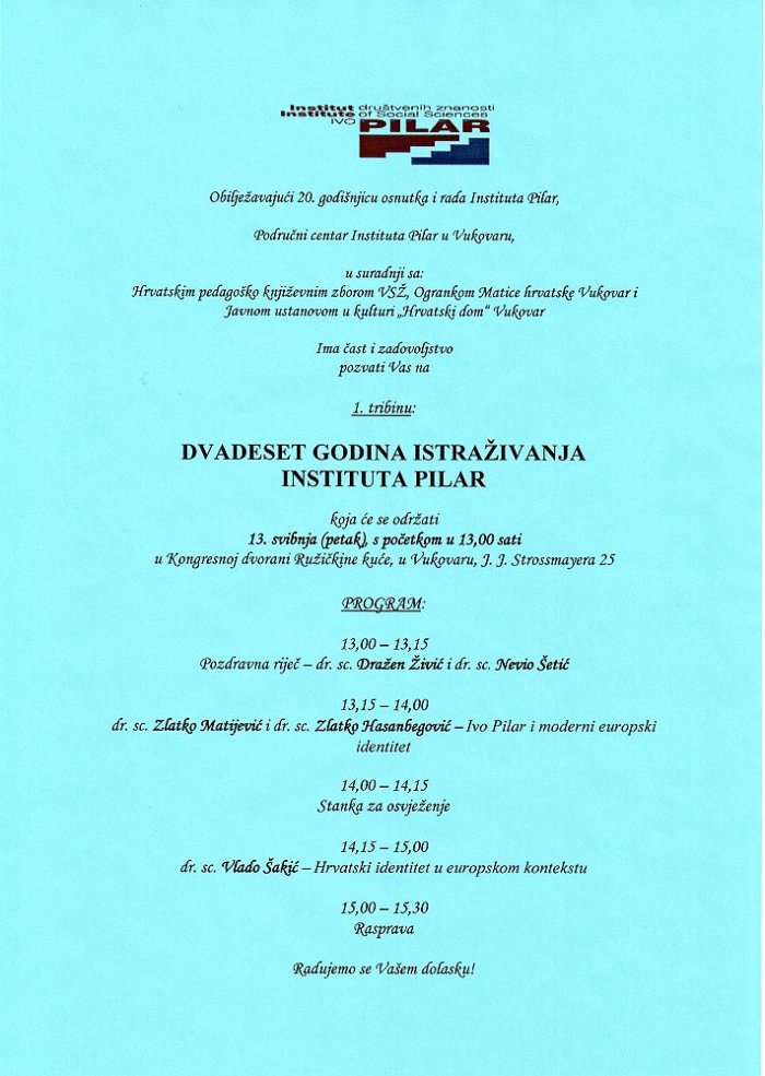 U Kongresnoj dvorani Ružičkine kuće u Vukovaru održana je 13. svibnja 2011. godine prva tribina “Dvadeset godina istraživanja Instituta Pilar”, na kojoj su govorili: dr. sc. Zlatko Matijević i dr. sc. Zlatko Hasanbegović o temi: “Ivo Pilar i moderni europski identitet” te dr. sc. Vlado Šakić o temi: “Hrvatski identitet u europskom kontekstu”