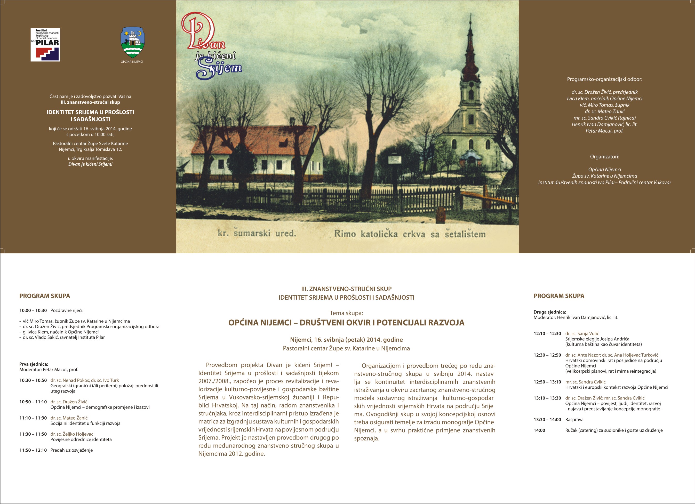 Općina Nijemci, Župa sv. Katarine u Nijemcima i Institut društvenih znanosti Ivo Pilar – Područni centar Vukovar organizirali su 3. znanstveno-stručni skup IDENTITET SRIJEMA U PROŠLOSTI I SADAŠNJOSTI koji se održao 16. svibnja 2014. u Pastoralnom centru Župe Svete Katarine u Nijemcima. Tema skupa bila je “Općina Nijemci – društveni okviri i potencijali razvoja” a održao se u sklopu manifestacije Divan je kićeni Srijem! – Program skupa