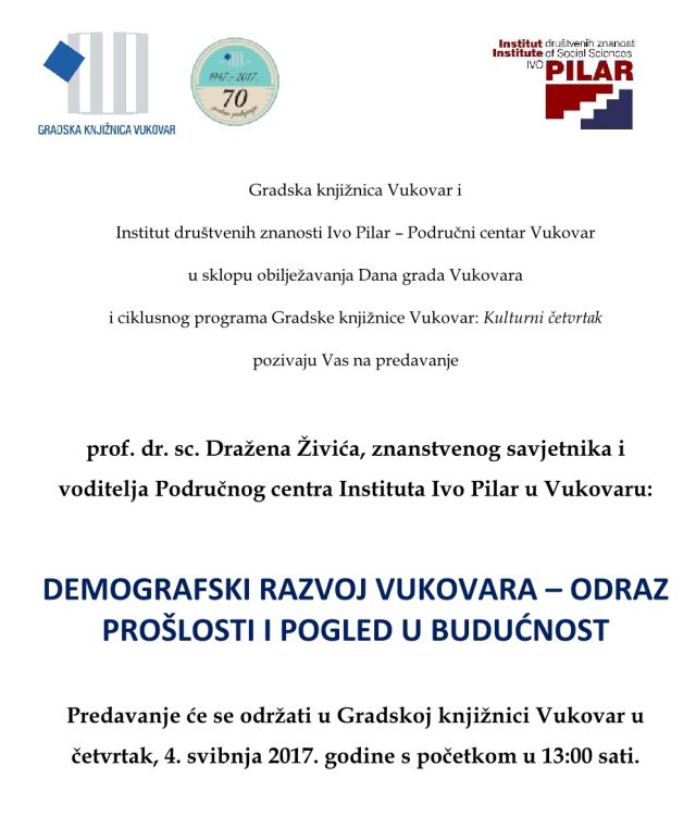 Gradska knjižnica Vukovar i Institut društvenih znanosti Ivo Pilar – Područni centar Vukovar u sklopu obilježavanja Dana grada Vukovara i ciklusnog programa Gradske knjižnice Vukovar: Kulturni četvrtak pozivaju na predavanje prof. dr. sc. Dražena Živića, znanstvenog savjetnika i voditelja Područnog centra Instituta Ivo Pilar u Vukovaru: DEMOGRAFSKI RAZVOJ VUKOVARA – ODRAZ PROŠLOSTI I POGLED U BUDUĆNOST. Predavanje će se održati u Gradskoj knjižnici Vukovar u četvrtak, 4. svibnja 2017. godine s početkom u 13 sati. – Pozivnica