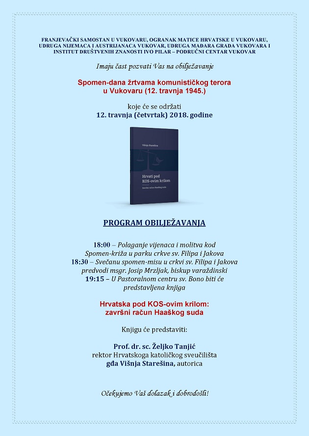Područni centar Instituta Pilar u Vukovaru, tradicionalno, sudjelovao je 12. travnja 2018. godine u obilježavanju Spomen-dana žrtvama komunističkog terora u Vukovaru 1945. godine. Uz Područni centar organizatori Spomen-dana su Franjevački samostan u Vukovaru, Udruga Nijemaca i Austrijanaca Vukovar, Udruga Mađara grada Vukovara i Ogranak Matice hrvatske u Vukovaru – Program