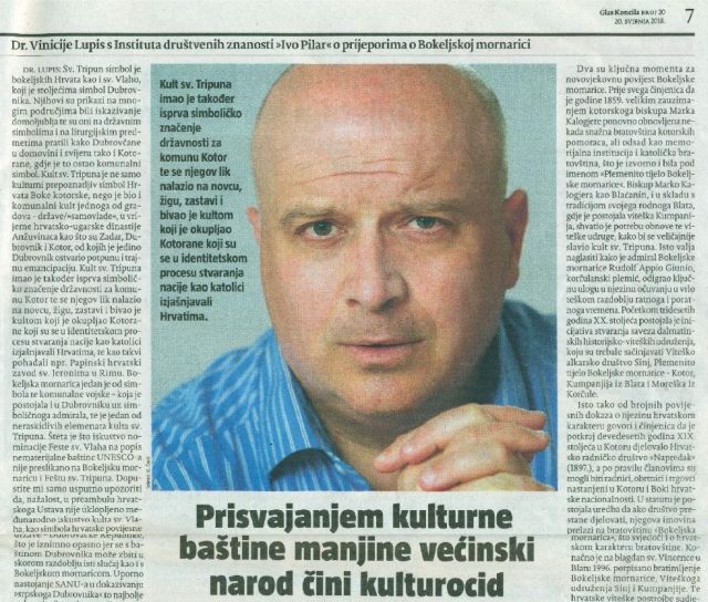 Glas Koncila u broju od 20. svibnja 2018. objavljuje razgovor s dr. sc. Vinicijem B. Lupisom o manipuliranju Bokeljskom mornaricom pod naslovom “Prisvajanjem kulturne baštine manjine većinski narod čini kulturocid”. – Razgovor