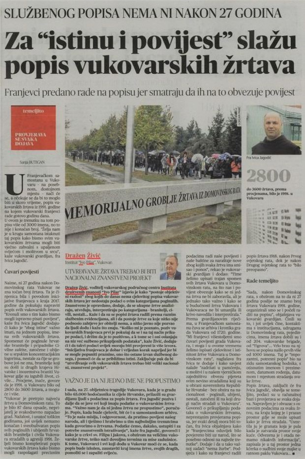 Portal i tiskano izdanje Glasa Slavonije od 22. studenoga 2018. objavljuju tekst pod naslovom “Za ‘istinu i povijest’ slažu popis vukovarskih žrtava. Franjevci predano rade na popisu jer smatraju da ih na to obvezuje povijest” u sklopu kojeg i izjavu dr. sc. Dražena Živića pod naslovom “Utvrđivanje žrtava trebao bi biti nacionalni znanstveni projekt”. − Glas Slavonije