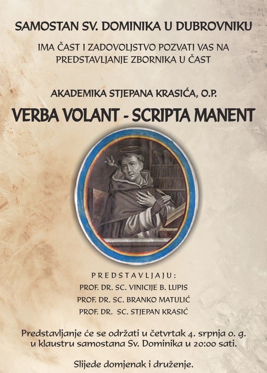 U klaustru Dominikanskog samostana 4. srpnja 2019. predstavljen je zbornik pod nazivom “Verba volant – Scripta manent”. Zbornik su predstavili doktori znanosti Vinicije B. Lupis, Branko Matulić i akademik Stjepan Krasić. Povod predstavljanja je Krasićev 80. rođendan, a zbornik okuplja radove 27 znanstvenika iz zemlje i inozemstva. − Pozivnica
