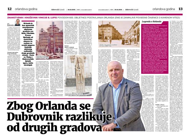 Dubrovački vjesnik u broju od 19. listopada 2019. donosi razgovor s dr. sc. Vinicijem B. Lupisom pod naslovom “Zbog Orlanda se Dubrovnik razlikuje od drugih gradova” u povodu 600. obljetnice postavljanja kamenog viteza. − Dubrovački vjesnik