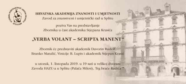 Hrvatska akademija znanosti i umjetnosti – Zavod za znanstveni i umjetnički rad u Splitu organizirao je 1. listopada 2019. u Palači Milesi predstavljanje Zbornika u čast akademika Stjepana Krasića VERBA VOLANT – SCRIPTA MANENT. Zbornik su predstavili akademik Davorin Rudolf, Branko Matulić, Vinicije B. Lupis i akademik Stjepan Krasić. − Pozivnica