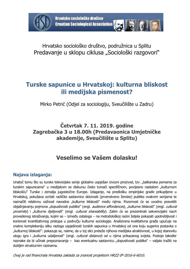 U okviru aktivnosti koje se provode na projektu GENMOD – „Relacijski rodni identiteti u Hrvatskoj: modernizacijske i razvojne perspektive“, u predavaonici Umjetničke akademije u Splitu je 7. studenog 2019. održan javni skup na kojemu su predstavljeni rezultati kvalitativnih analiza na projektu na temu kulturne bliskosti žena u Hrvatskoj i turskih sapunica. Rezultate je predstavio mr.sc. Mirko Petrić, izlaganjem naslovljenim „Turske sapunice u Hrvatskoj: kulturna bliskost ili medijska pismenost?“. − Pozivnica