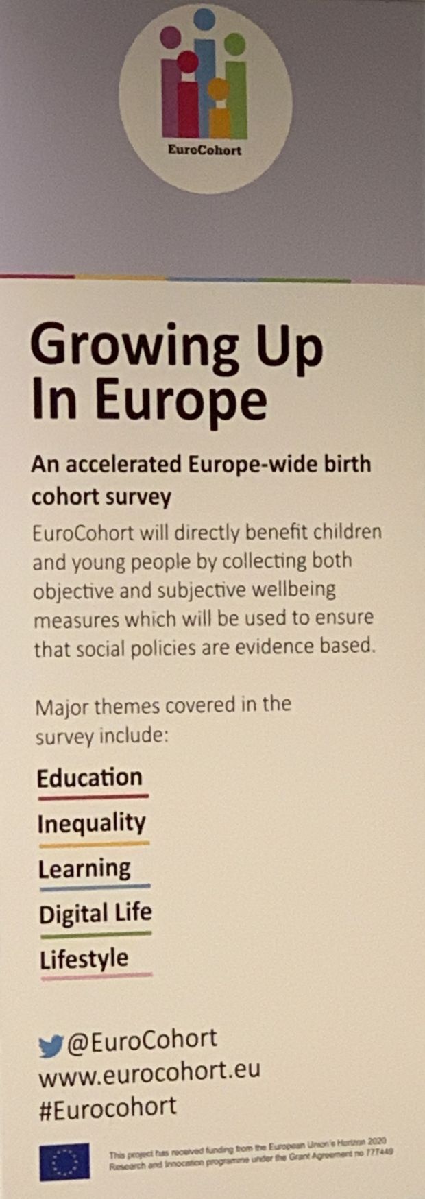 Na završnoj konferenciji projekta EuroCohort: Odrastati u Europi (Growing Up in Europe) donositeljima javnih politika na europskoj i nacionalnim razinama predstavljene su pripreme obavljene za provedbu europskoga longitudinalnog istraživanja Growing Up in Europe. Plenarni predavači Dominic Richardson (UNICEF), Jana Hainsworth (Eurochild) i Dominik Sobczak (ESFRI, Europska komisija) istaknuli su ograničenja postojećih podataka o dobrobiti djece i mladih, važnost kvalitetnih i longitudinalnih podataka za utemeljene javne politike, potrebu za longitudinalnim krosnacionalnim europskim podacima o dobrobiti djece i mladih te mogućnostima da istraživanje Odrastati u Europi postane jedna od europskih istraživačkih infrastruktura.