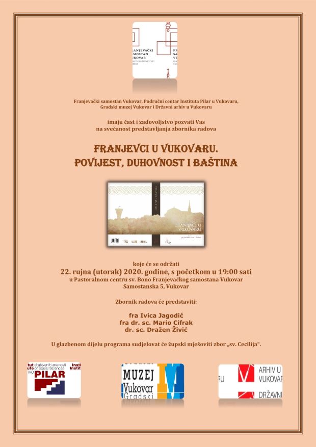 Franjevački samostan Vukovar, Područni centar Instituta Pilar u Vukovaru, Gradski muzej Vukovar i Državni arhiv u Vukovaru organizirali su predstavljanje zbornika radova FRANJEVCI U VUKOVARU. POVIJEST, DUHOVNOST I BAŠTINA koje se održalo 22. rujna 2020. u Pastoralnom centru sv. Bono Franjevačkog samostana Vukovar, Samostanka 5.Pozivnica