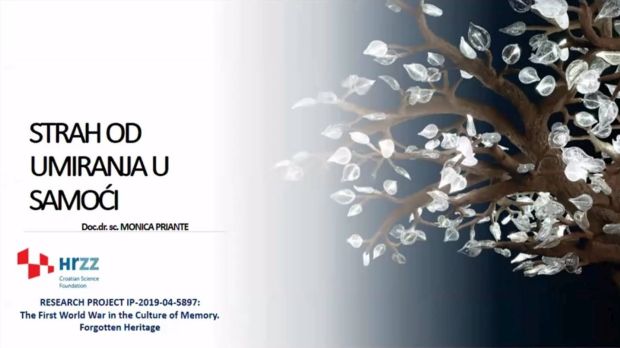 Članica istraživačkog tima HRZZ-a projekta Prvi svjetski rat u kulturi sjećanja. Zaboravljena baština, dr. sc. Monica Priante u sklopu svojih projektnih aktivnosti sudjelovala je s predavanjem pod naslovom „Strah od umiranja u samoći“ na znanstvenom skupu s međunarodnim sudjelovanjem „COVID-19 u humanističkoj perspektivi: mutacije straha i kulturne promjene“. – Program skupa