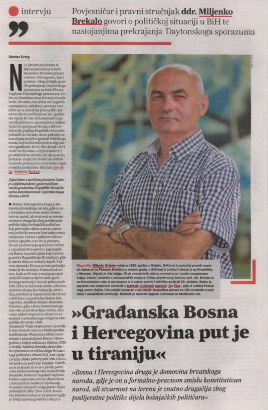 Glas Koncila u broju od 1. kolovoza 2021. objavljuje razgovor s ddr. sc. Miljenkom Brekalom pod naslovom “Građanska Bosna i Hercegovina put je u tiraniju”. – Glas Koncila