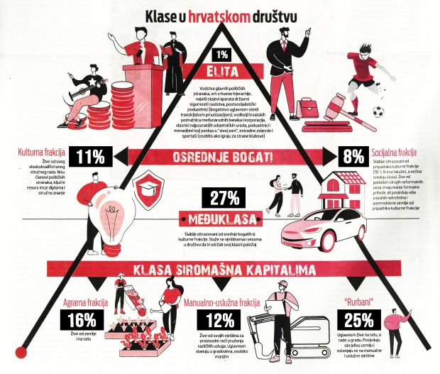 – Pripadnike elite, koji se u pravilu ne odazivaju pozivima za anketna ispitivanja čime posredno pokazuju svoju moć nemamo u uzorku, no da bismo procijenili njihov profil, način djelovanja i resurse iz koji izvlače društvene moći, poslužili smo se drugim metodama (kvalitativnim i istraživanjem sekundarnih podataka). Može se procijeniti da se u elitu ubraja četrdesetak tisuća ljudi, odnosno približno 1% stanovništva. Kad je riječ o klasi osrednje razine kapitala pripadnika “kulturne” frakcije imamo 11%, a “socijalne” frakcije 8%. U vrijeme provođenja istraživanja u uzorku je bilo 16% pripadnika agrarne frakcije klase siromašne kapitalima, 25% “rurbanih“, te 12% manualno-uslužne frakcije, a pripadnika “međuklase 27% – kaže Petrić.