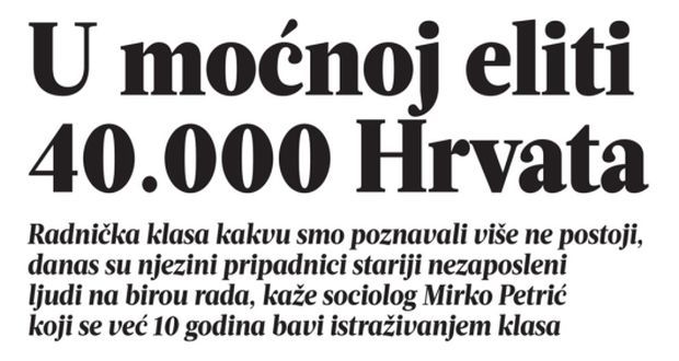 – Uzimajući u obzir različite generatore nejednakosti koji dovode do razlika u „društvenim moćima” odnosno razlika u tome koliko netko može nešto postići sa znanjima, vezama, novcem, u hrvatskom društvu postoji vrlo tanak sloj elite koji se račva na „političku” i „estradnu” frakciju. U prvoj su vodstva glavnih političkih stranaka, osobito kad su na vlasti i zauzimaju ključne državne položaje, sam vrh crkvene hijerarhije, kao i najviši slojevi aparata državne sigurnosti, nekadašnjeg i sadašnjeg, te sudstva. Glavni resurs im je politička moć koja donosi društvene povlastice. U elitu se ubrajaju i veliki postsocijalistički poduzetnici koji su bogatstvo uglavnom stekli tranzicijskom privatizacijom, voditelji hrvatskih podružnica međunarodnih banaka i korporacija (neki su od njih strani državljani), vlasnici najpoznatijih odvjetničkih ureda i na kraju poduzetnici i menadžeri koji na različite načine posluju u “sivoj zoni” Tu su još i estradne zvijezde i sportaši, i to osobito ako igraju za strane klubove. To je „elita” u Hrvatskoj, to su povlaštene grupe sa snažnim društvenim moćima – govori Petrić. A tko je danas srednja klasa u Hrvatskoj?
