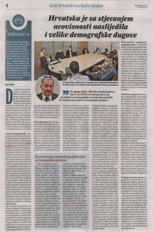 Na panelu Demografija održanom u zgradi Hrvatske biskupske konferencije (HBK) u Zagrebu u sklopu Šestog hrvatskog socijalnog tjedna govornici su prikazali negativne demografske trendove, upozorivši na opasnost odgađanja primjene mjera demografskih politika. Pomoćnik ravnatelja Instituta društvenih znanosti Ivo Pilar dr. sc. Dražen Živić upozorio je da je Hrvatska u dubokoj demografskoj krizi koja je počela još šezdesetih godina protekloga stoljeća. Dr. sc. Živić smatra da demografska obnova, sa svim svojim parcijalnim politikama – populacijskom, migracijskom, obiteljskom, stambenom, ekonomskom, socijalnom, poreznom i regionalnom mora biti u funkciji usporavanja te zaustavljanja negativnih demografskih trendova.