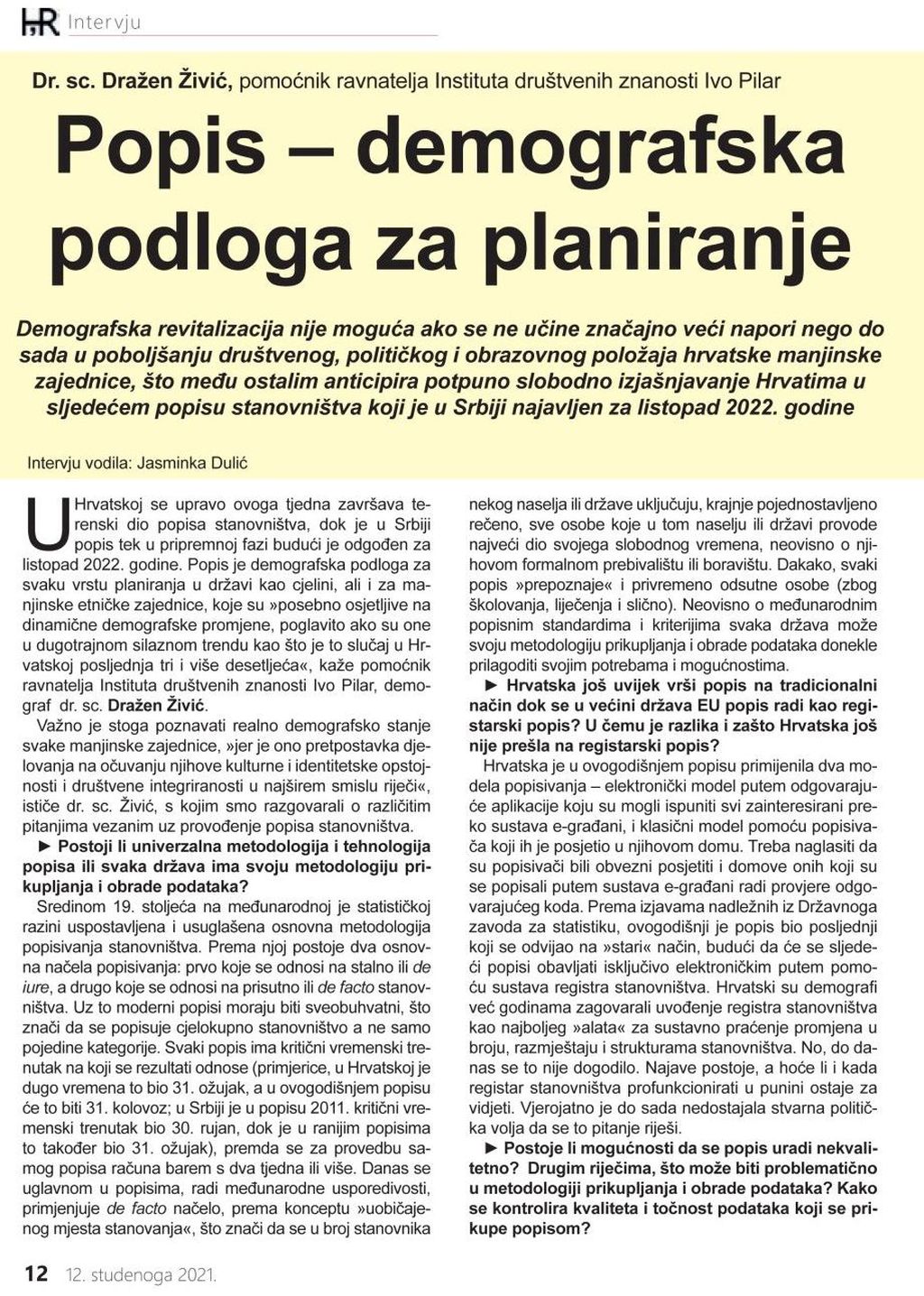 Subotičke tjedne novine i portal na hrvatskome jeziku Hrvatska riječ objavljuju 12. studenoga 2021. razgovor Jasminke Dulić s dr. sc. Draženom Živićem pod naslovom “Popis – demografska podloga za planiranje”.Hrvatska riječ