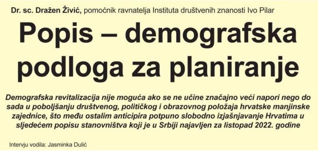 U Hrvatskoj se upravo ovoga tjedna završava terenski dio popisa stanovništva, dok je u Srbiji popis tek u pripremnoj fazi budući je odgođen za listopad 2022. godine. Popis je demografska podloga za svaku vrstu planiranja u državi kao cjelini, ali i za manjinske etničke zajednice, koje su »posebno osjetljive na dinamične demografske promjene, poglavito ako su one u dugotrajnom silaznom trendu kao što je to slučaj u Hrvatskoj posljednja tri i više desetljeća«, kaže pomoćnik ravnatelja Instituta društvenih znanosti Ivo Pilar, demograf dr. sc. Dražen Živić.