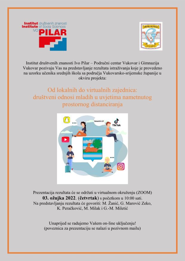 Institut društvenih znanosti Ivo Pilar – Područni centar Vukovar i Gimnazija Vukovar organizirali su predstavljanje rezultata istraživanja provedenog u okviru projekta ˝Od lokalnih do virtualnih zajednica. Društveni odnosi mladih u uvjetima nametnutog prostornog distanciranja˝ koje se održalo 3. ožujka 2022. Pozivnica