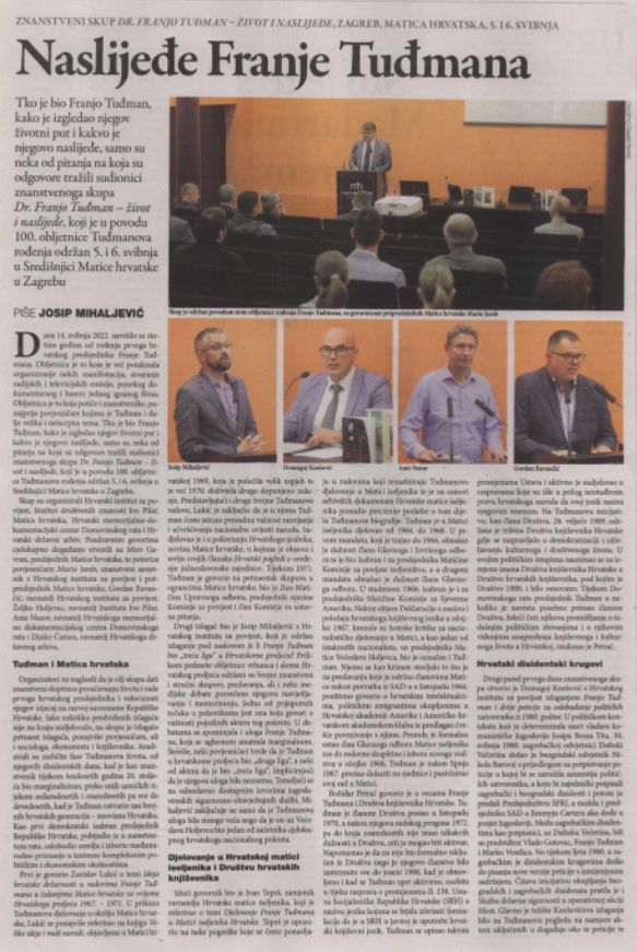 U povodu stote obljetnice rođenja prvog predsjednika Republike Hrvatske dr. sc. Franje Tuđmana, Hrvatski institut za povijest, Institut društvenih znanosti Ivo Pilar i Matica hrvatska organizirali su znanstveni skup pod naslovom „Dr. Franjo Tuđman – život i naslijeđe“, koji se održao u Zagrebu 5. i 6. svibnja 2022. godine u Dvorani Jure Petričevića Matice hrvatske.