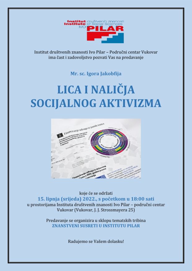Institut društvenih znanosti Ivo Pilar – Područni centar Vukovar organizirao je predavanje mr. sc. Igora Jakobfija LICA I NALIČJA SOCIJALNOG AKTIVIZMA koje se održalo 15. lipnja 2022. u prostorijama Instituta društvenih znanosti Ivo Pilar – Područni centar Vukovar (Vukovar, J. J. Strossmayera 25). Predavanje je organizirano u sklopu tematskih tribina ZNANSTVENI SUSRETI U INSTITUTU PILAR