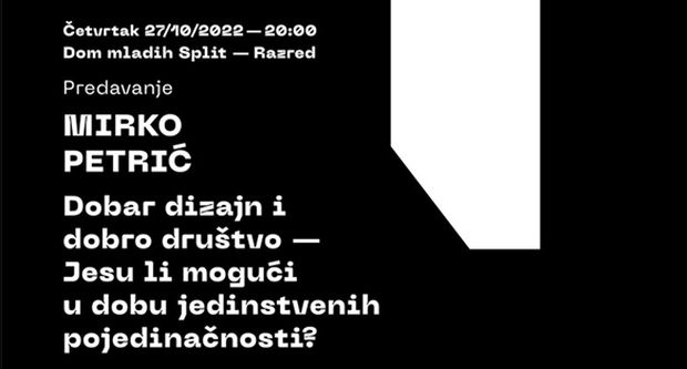 Mr. sc. Mirko Petrić održao je 27. 10. 2022. predavanje s naslovom „Dobar dizajn i dobro društvo – jesu li mogući u dobu jedinstvenih pojedinačnosti?“ Predavanje je održano u dvorani „Razred“ u splitskom Domu mladih, u okviru Festivala vizualne kulture Kombo, koji organiziraju članovi/ce udruge studenata/ica dizajna vizualnih komunikacija na Umjetničkoj akademiji Sveučilišta u Splitu. – Program Kombo festivala