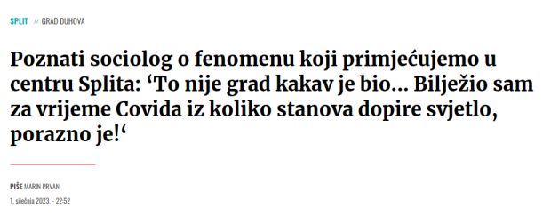 – Slobodna Dalmacija: Poznati sociolog o fenomenu koji primjećujemo u centru Splita: ‘To nije grad kakav je bio… Bilježio sam za vrijeme Covida iz koliko stanova dopire svjetlo, porazno je!‘, 1. 1. 2023.