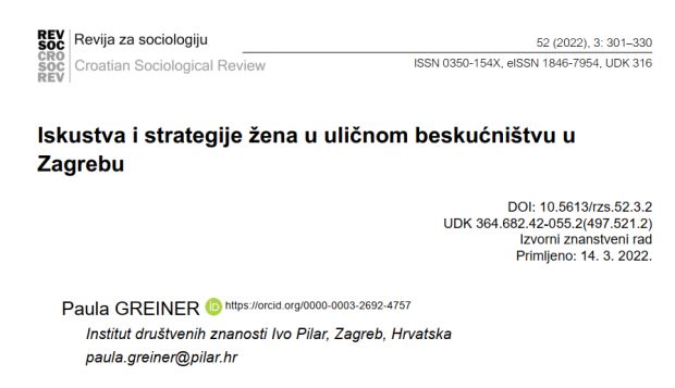 Revija za sociologiju u broju 3/2022. objavljuje izvorni znanstveni rad Paule Greiner pod naslovom “Iskustva i strategije žena u uličnom beskućništvu u Zagrebu”. Rad donosi rezultate istraživanja provedenog u okviru projekta Instituta Pilar Exploring Homelessness and Pathways to Social Inclusion: A Comparative Study of Contexts and Challenges in Swiss and Croatian Cities (No. IZHRZO_180631/1) koji su pobudili pozornost brojnih hrvatskih medija. – Iz medija