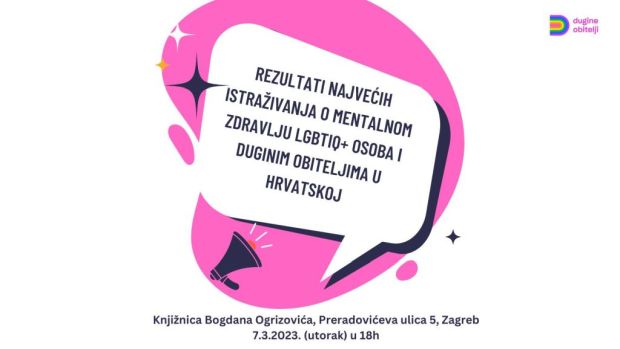 Dana 7. ožujka 2023. (utorak) u 18 sati sati u Knjižnici Bogdana Ogrizovića (Preradovićeva 5, Zagreb) održat će se predstavljanje rezultata dvaju istraživanja provedenih na do sada najvećim uzorcima LGBTIQ+ osoba u Hrvatskoj