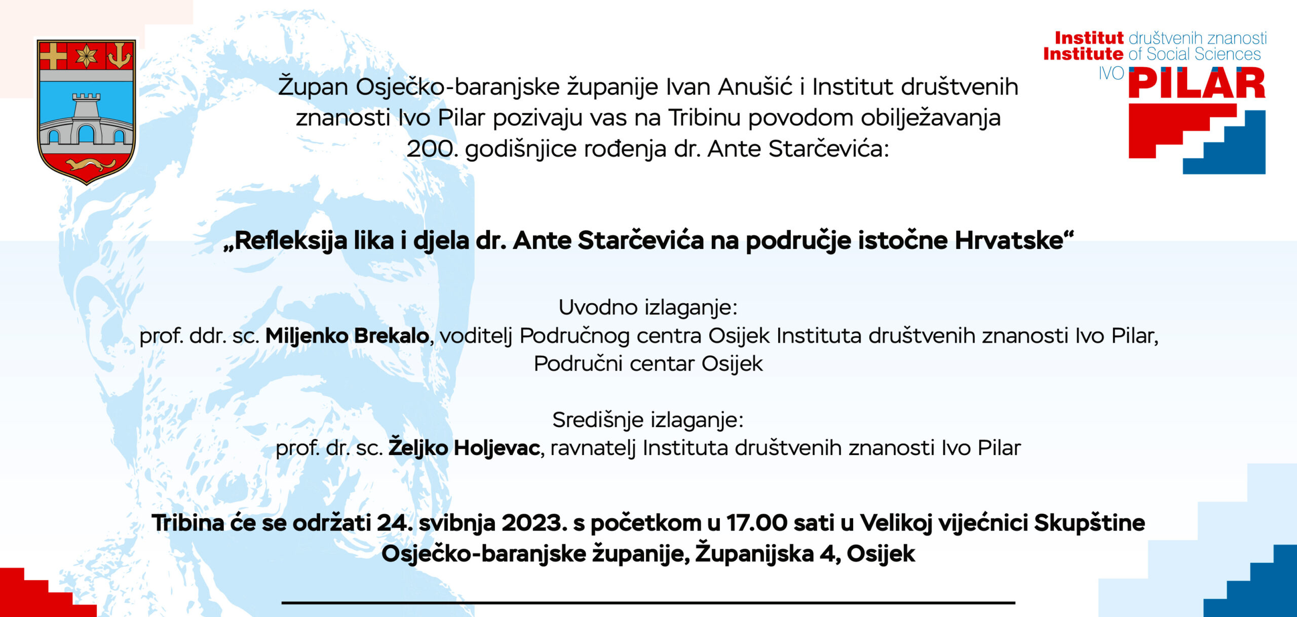Osječko-baranjska županija i Institut društvenih znanosti Ivo Pilar organizirali su Tribinu povodom obilježavanja 200. godišnjice rođenja dr. Ante Starčevića pod naslovom “Refleksija lika i djela dr. Ante Starčevića na području istočne Hrvatske”. Tribina se održala 24. svibnja 2023. u Velikoj vijećnici Skupštine Osječko-baranjske županije. – Iz medija