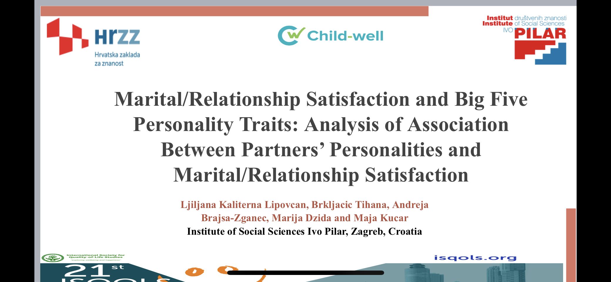 Dr. sc. Brajša-Žganec izlagala je na temu “Marital/Relationship Satisfaction and Big Five Personality Traits: Analysis of Association Between Partners’ Personalities and Marital/Relationship Satisfaction (Zadovoljstvo brakom/partnerstvom i Big Five osobine ličnosti: analiza povezanosti između osobina ličnosti partnera i zadovoljstva brakom/partnerstvom). Suautori rada su dr. sc. Ljiljana Kaliterna Lipovčan, dr. sc. Tihana Brkljačić, Marija Džida i Maja Kućar.