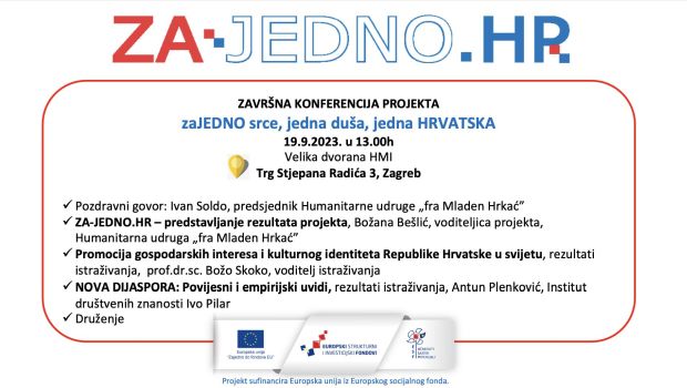 Humanitarna udruga „fra Mladen Hrkać“ poziva na ZAVRŠNU KONFERENCIJU projekta zaJEDNO srce, jedna duša, jedna Hrvatska, koja će se održati u utorak, 19. rujna 2023., s početkom u 13 sati, u zgradi Hrvatske matice iseljenika, na adresi Trg Stjepana Radića 3, 10000 Zagreb