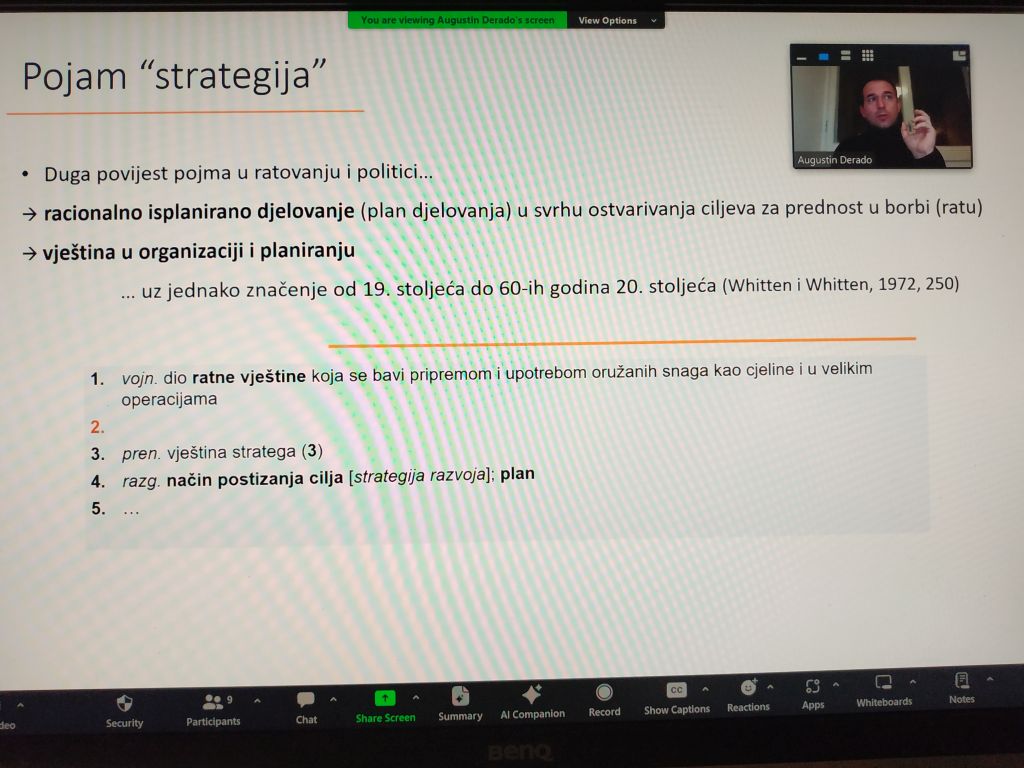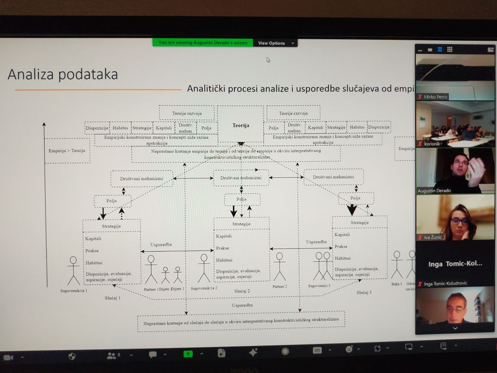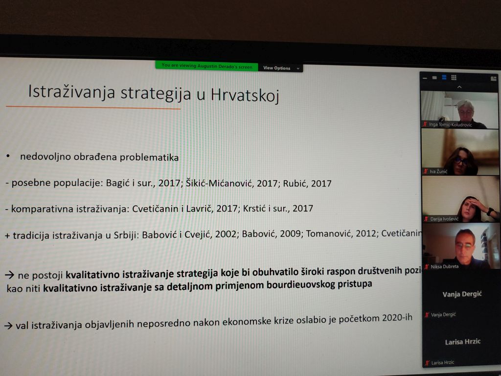 Jedno i pol satno izlaganje, i rasprava otprilike istog trajanja, organizirani su pred publikom od 30-ak znanstvenica, znanstvenika i studenata/ica sociologije na Sveučilištu u Splitu uz korištenje mrežne platforme Zoom. U zaključnom dijelu rasprave istaknuti su i neki tematski i teorijski aspekti korisni za daljnja promišljanja i empirijska istraživanja strategija u Hrvatskoj.