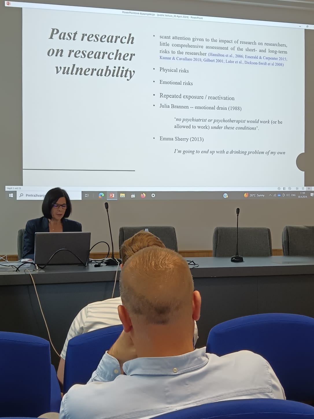 Predavanje je tematiziralo potrebu zaštite istraživača u etnografskim istraživanjima osjetljivih, marginalnih skupina, koje karakterizira uronjenost, refleksivnost i odnos. Naglasak je stavljen na neke od skrivenih i/ili zanemarenih aspekata ranjivosti istraživača koji se obično previđaju ili nedovoljno istražuju. Predavanje je održano na engleskom jeziku, kao i zanimljiva rasprava koja je uslijedila nakon brojnih pitanja iz publike.