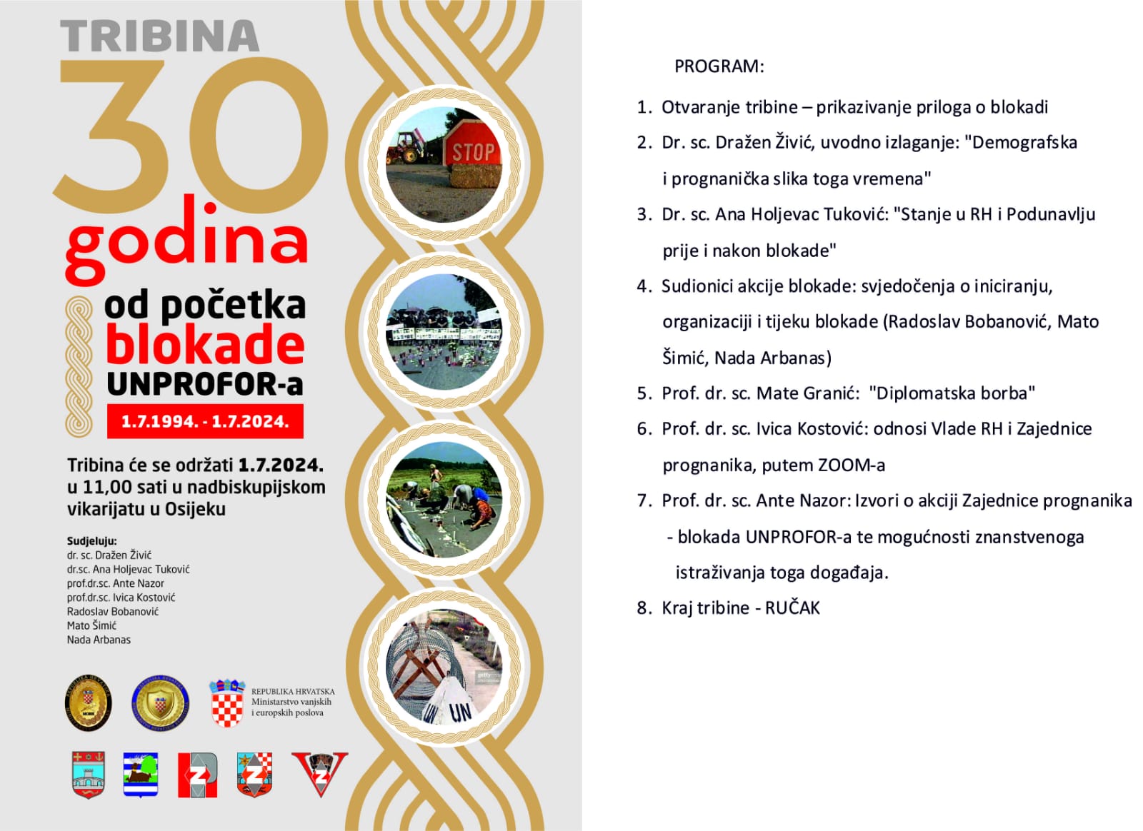 Pomoćnik ravnatelja Instituta društvenih znanosti Ivo Pilar dr. sc. Dražen Živić sudjelovao je na tribini “30 godina od početka blokade UNPROFOR-a (1. 7. 1994. – 1. 7. 2024.)”, koja je održana u Nadbiskupijskom vikarijatu u Osijeku 1. srpnja 2024. godine. Organizatori tribine su bili Zajednica povratnika hrvatskoga Podunavlja i Zajednica povratnika Osječko-baranjske županije