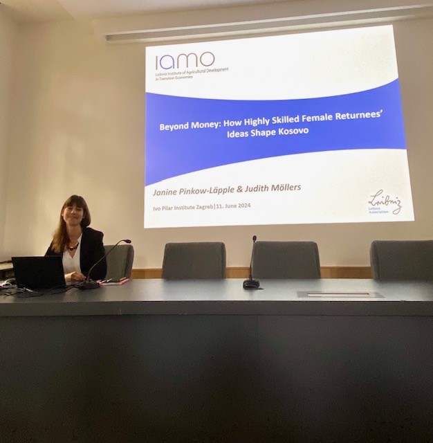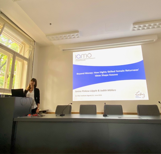 Janine Pinkow-Läpple održala je gostujuće predavanje u Institutu društvenih znanosti Ivo Pilar 11. lipnja 2024. pod naslovom: “Beyond Money: How Highly Skilled Female Returnees’ Ideas Shape Kosovo” u sklopu projekta DinamiRH. Predavanju je nazočio ravnatelj Instituta dr. sc. Željko Holjevac te istraživači i suradnici projekta DinamiRH