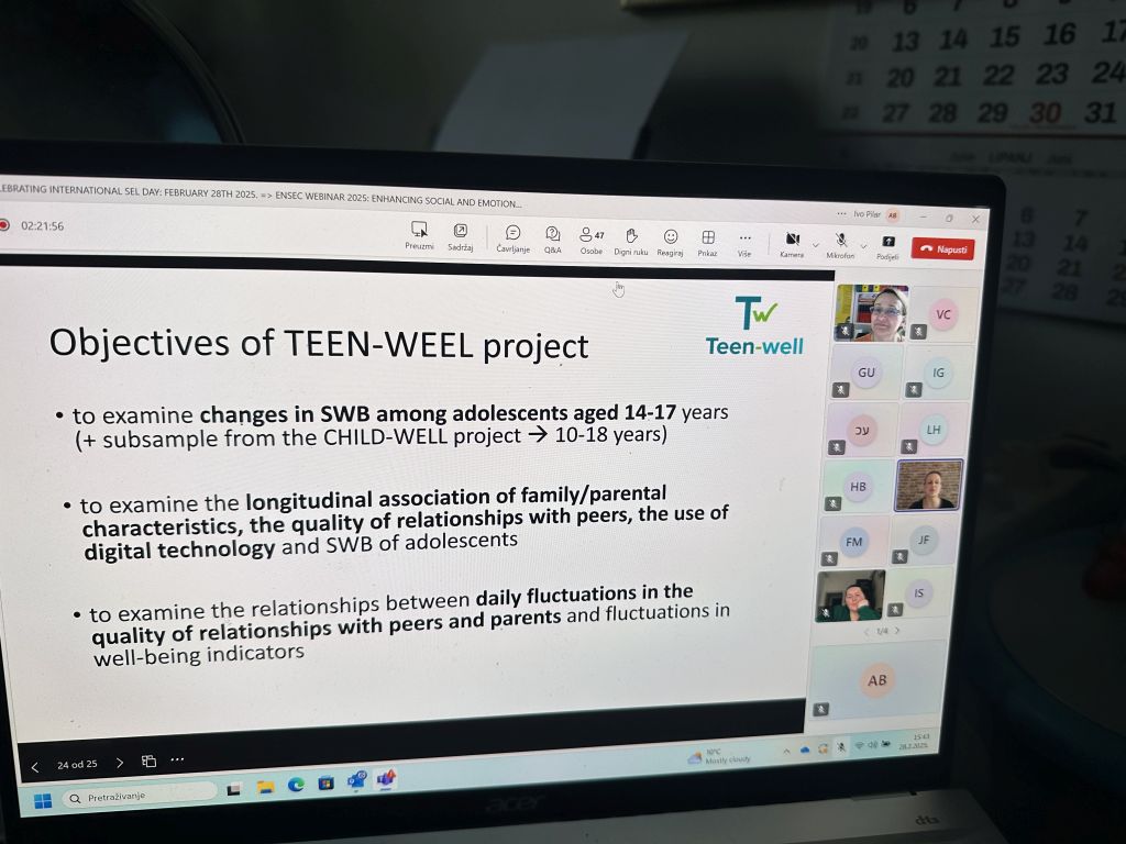U sklopu mreže ENSEC, European Network for Social and Emotional Competence, održan je 28. veljače 2025. u povodu Međunarodnog dana SEL-a webinar na kojem je dr. sc. Ivana Hanzec Marković, vanjska suradnica na projektu Teen-well, predstavila je rezultate projekta Dobrobit djeteta u kontekstu obitelji Child-well i povezanost s projektom Dobrobit adolescenata u ključnim kontekstima Teen-well