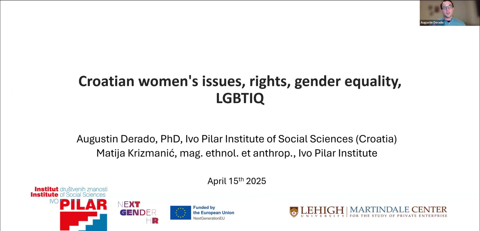 Članovi projekta NextGenderHR (Promjene rodnih odnosa u Hrvatskoj), dr. sc. Augustin Derado i Matija Krizmanić, mag., održali su 15. travnja 2025. godine pozvana predavanja studentima Martindale Centra za proučavanje privatnog poduzetništva pri Sveučilištu Lehigh (Pennsylvania, SAD), na temu rodne ravnopravnosti i izazova u Hrvatskoj