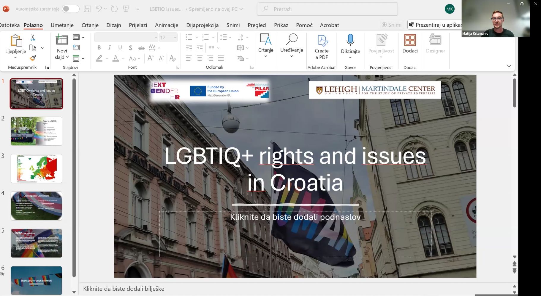 Matija Krizmanić, mag., predstavio je izlaganje s naslovom LGBTIQ+ rights and issues in Croatia, fokusirajući se na rodno-spolne prijepore u trenutnoj političkoj klimi.