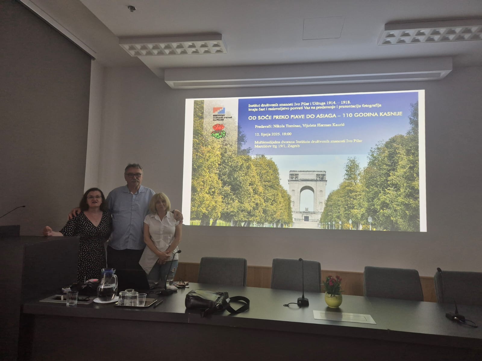 Institut društvenih znanosti Ivo Pilar i Udruga 1914. – 1918. organizirali su predavanje i prezentaciju fotografija OD SOČE PREKO PIAVE DO ASIAGA – 110 GODINA KASNIJE koji su se održali 12. lipnja 2025. u Multimedijalnoj dvorani Instituta Pilar, Zagreb, Marulićev trg 19/I. Predavači su bili Nikola Tominac i Vijoleta Herman Kaurić