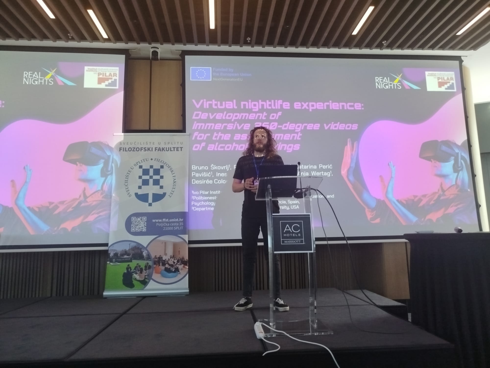 Asistent Bruno Škovrlj predstavio je na konferenciji rad pod naslovom „Virtual nightlife experience: Development of immersive 360-degree videos for the assessment of alcohol cravings“, izrađen u sklopu znanstvenoistraživačkog projekta Istraživanje noćnog života: realno i virtualno okruženje (REAL NIGHTS). U radu je prikazan postupak osmišljavanja i snimanja uranjajućih okruženja u virtualnoj stvarnosti. Također je opisana predviđena primjena snimljenih sadržaja u eksperimentalnom istraživanju, kao i potencijalne implikacije dobivenih rezultata.