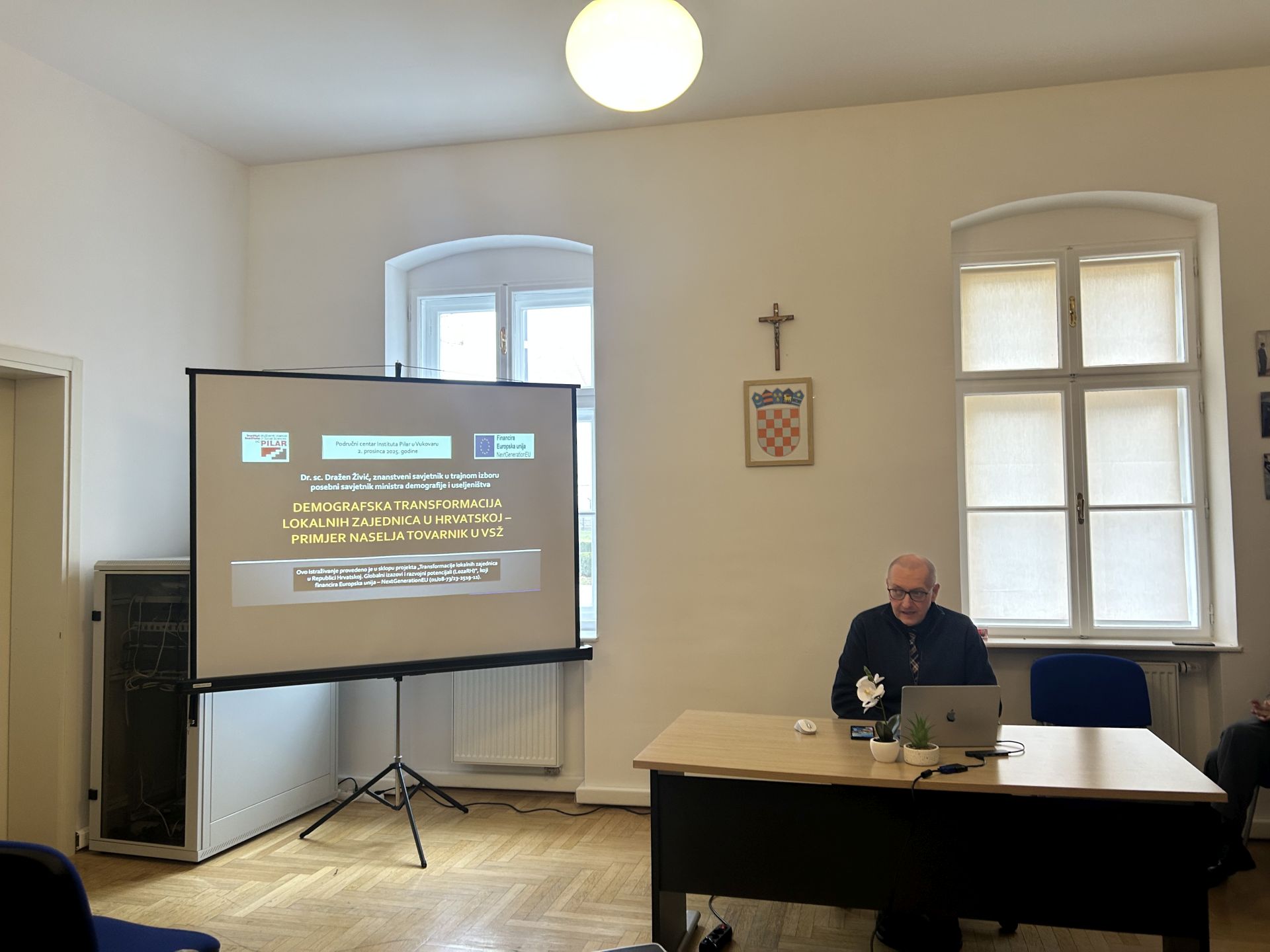 U Knjižnici Područnoga centra Instituta Pilar u Vukovaru, u sklopu tradicionalne tribine Znanstveni utorak u Institutu Pilar, dr. sc. Dražen Živić održao je 2. prosinca 2025. godine predavanje na temu “Demografska transformacija lokalnih zajednica u Hrvatskoj – primjer naselja Tovarnik u Vukovarsko-srijemskoj županiji”. U predavanju je dr. sc. Živić predstavio dio rezultata istraživanja u institutskom projektu Transformacije lokalnih zajednica u Republici Hrvatskoj. Globalni izazovi i razvojni potencijali (LozaRH) financiranom sredstvima Europske unije (NextGenerationEU), a kojega je voditelj dr. sc. Mateo Žanić