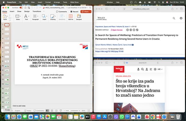 Uz to istaknut je značajan znanstveni uspjeh postignut objavljivanjem članka „In Search for Spaces of Wellbeing: Predictors of Transition From Temporary to Permanent Residency Among Second Home Users in Croatia“ (https://doi.org/10.1002/psp.70160) u časopisu Population, Space and Place, jednom od globalno vodećih interdisciplinarnih časopisa posvećenih istraživanju odnosa između stanovnika i prostora koji nastanjuju.