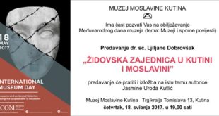 U sklopu teme Muzeji i sporne povijesti Međunarodnog dana muzeja dr. sc. Ljiljana Dobrovšak održala je u Muzeju Moslavine Kutina 18. svibnja 2017. predavanje pod naslovom “Židovska zajednica u Kutini i Moslavini”. – Pozivnica – Pozivnica za predavanje dr. sc. Ljiljane Dobrovšak “Židovska zajednica u Kutini i Moslavini”; Kutina, 18. svibnja 2017. >>> Dr. sc.… Pročitaj više o Dr. sc. Ljiljana Dobrovšak: “Židovska zajednica u Kutini i Moslavini”